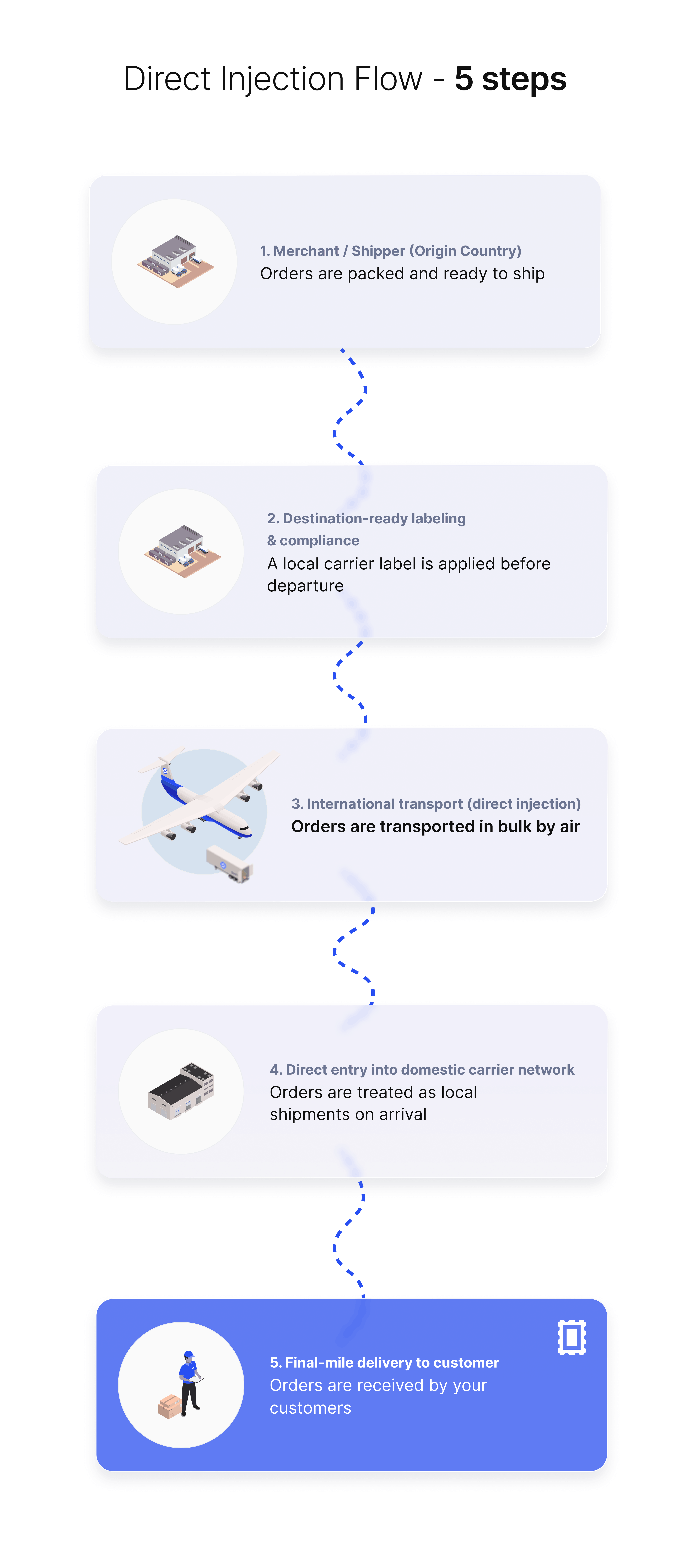 When people talk about "direct injection," they're describing a cross-border shipping model where parcels are consolidated at origin, transported in bulk by air, and injected directly into the destination country's domestic carrier network, bypassing the traditional international express system and its many handoffs.